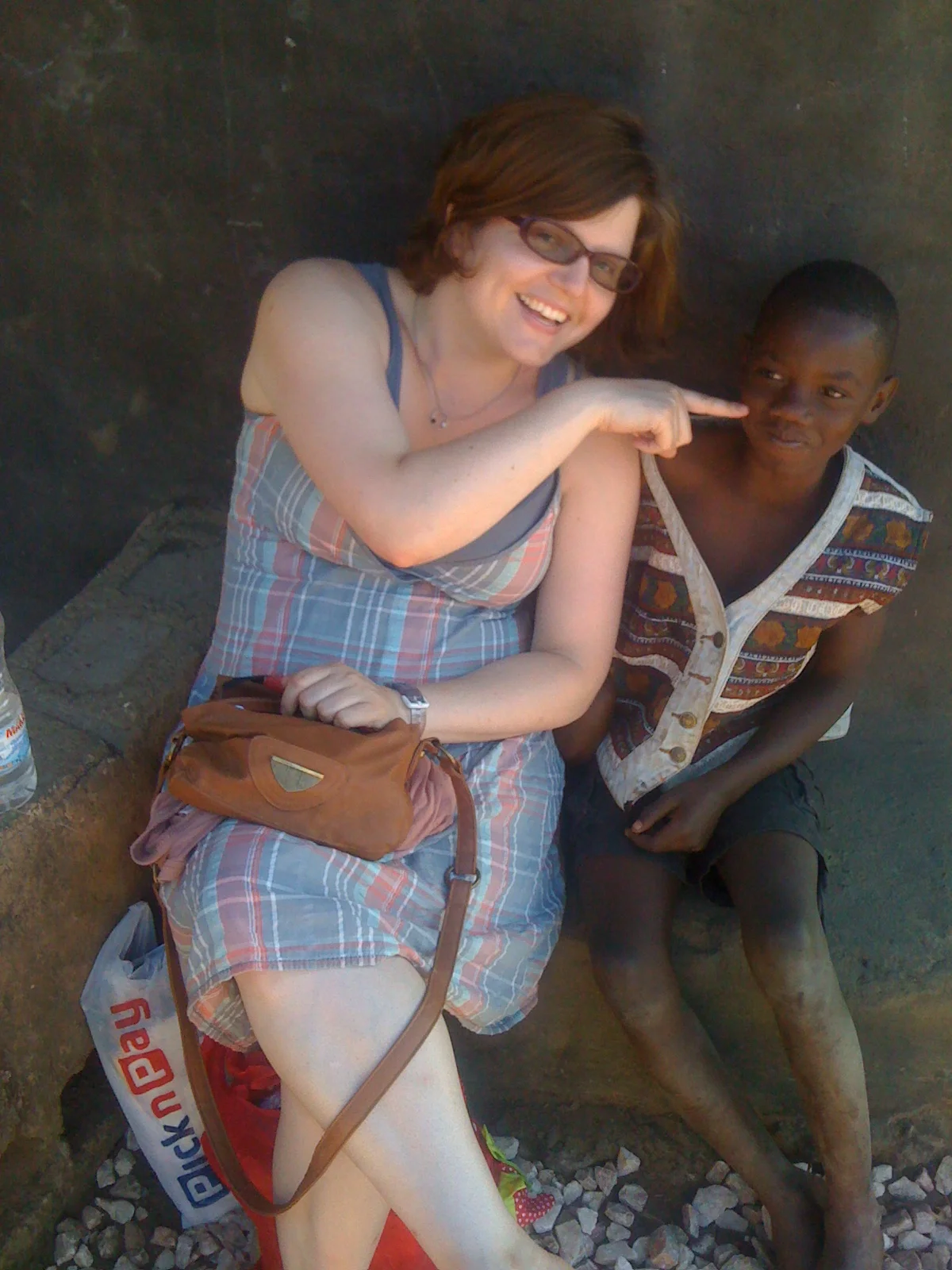 Nikki Packer Learns the Zambian handshake from the children at the Lubuto Library Project