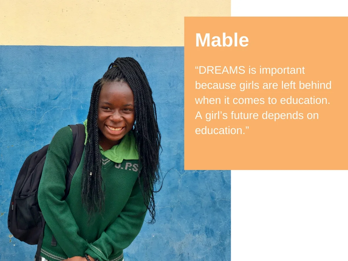 While she feels support from her parents, Mable sometimes feels like people don’t believe in her future and her aspirations and it makes her feel sad. Mable explained, “Girls are taught that education is not for them, that their place is in the home. The DREAMS program is important because it is helping girls have self-confidence. It helps girls believe that they should be in school and can do what boys do. It helps them believe in themselves.” Mable wants to help other girls believe in themselves, not give up, and stay in school.